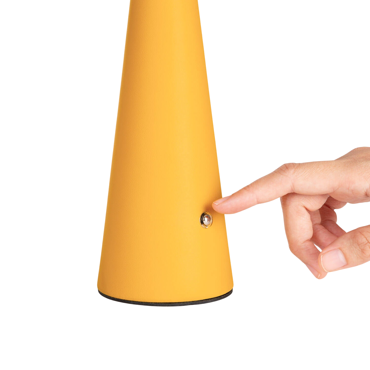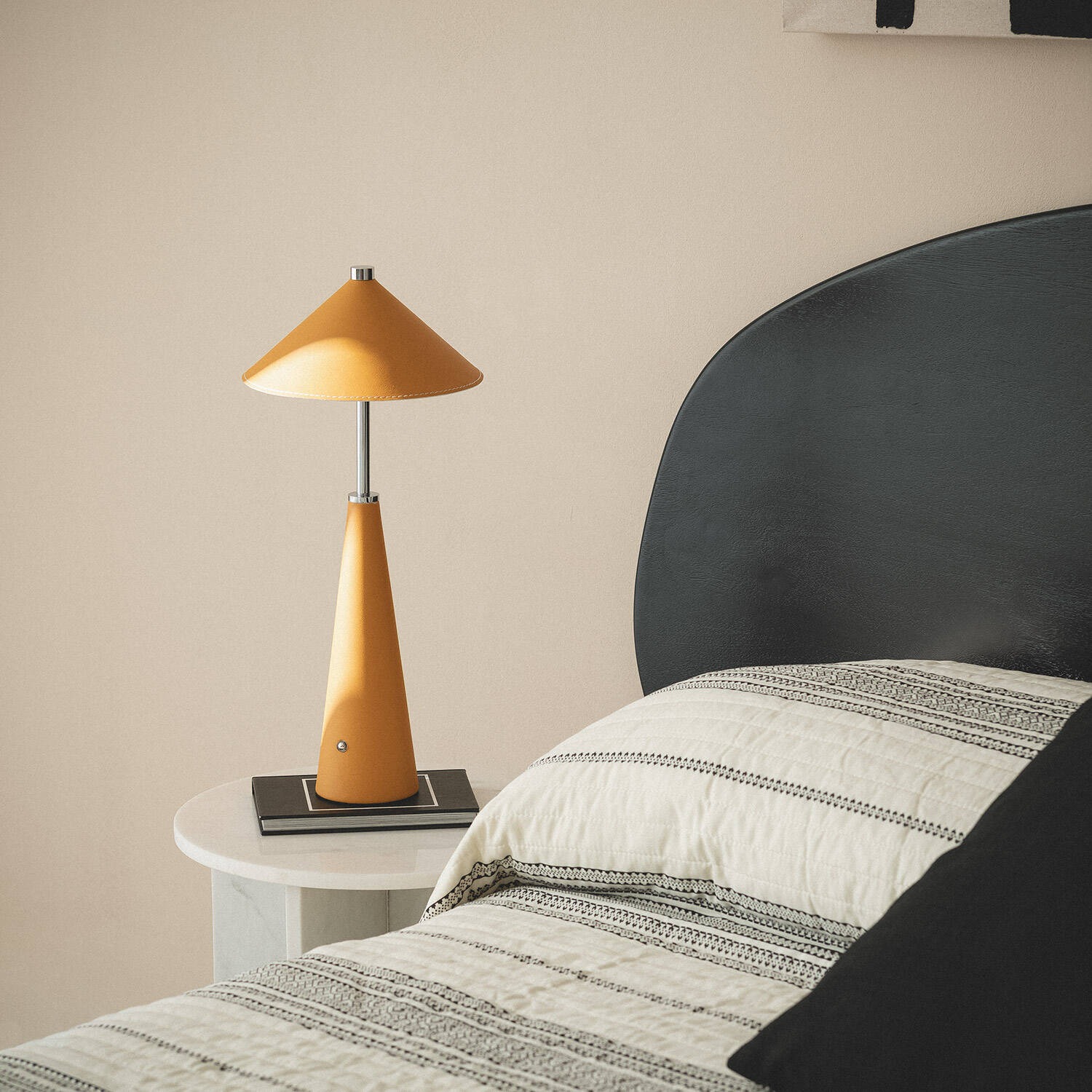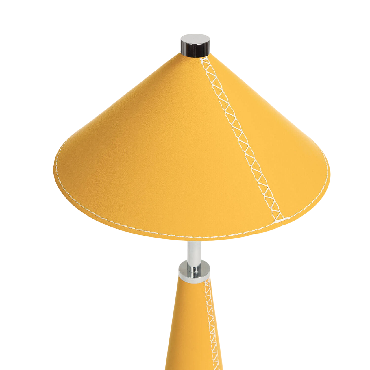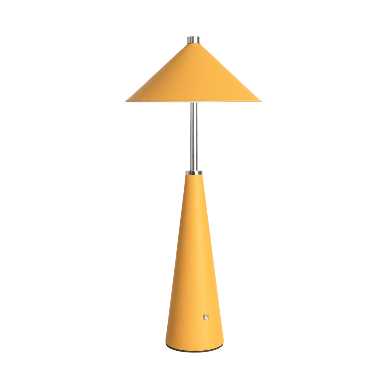 De combinatie van leer en metaal geeft deze tafellamp een luxe en eigentijdse uitstraling. Het gele oppervlak straalt rust en warmte uit, terwijl het conische design en de strakke lijnen perfect passen in moderne, minimalistische en Scandinavische interieurs. Een subtiel accent dat moeiteloos sfeer toevoegt aan iedere ruimte.